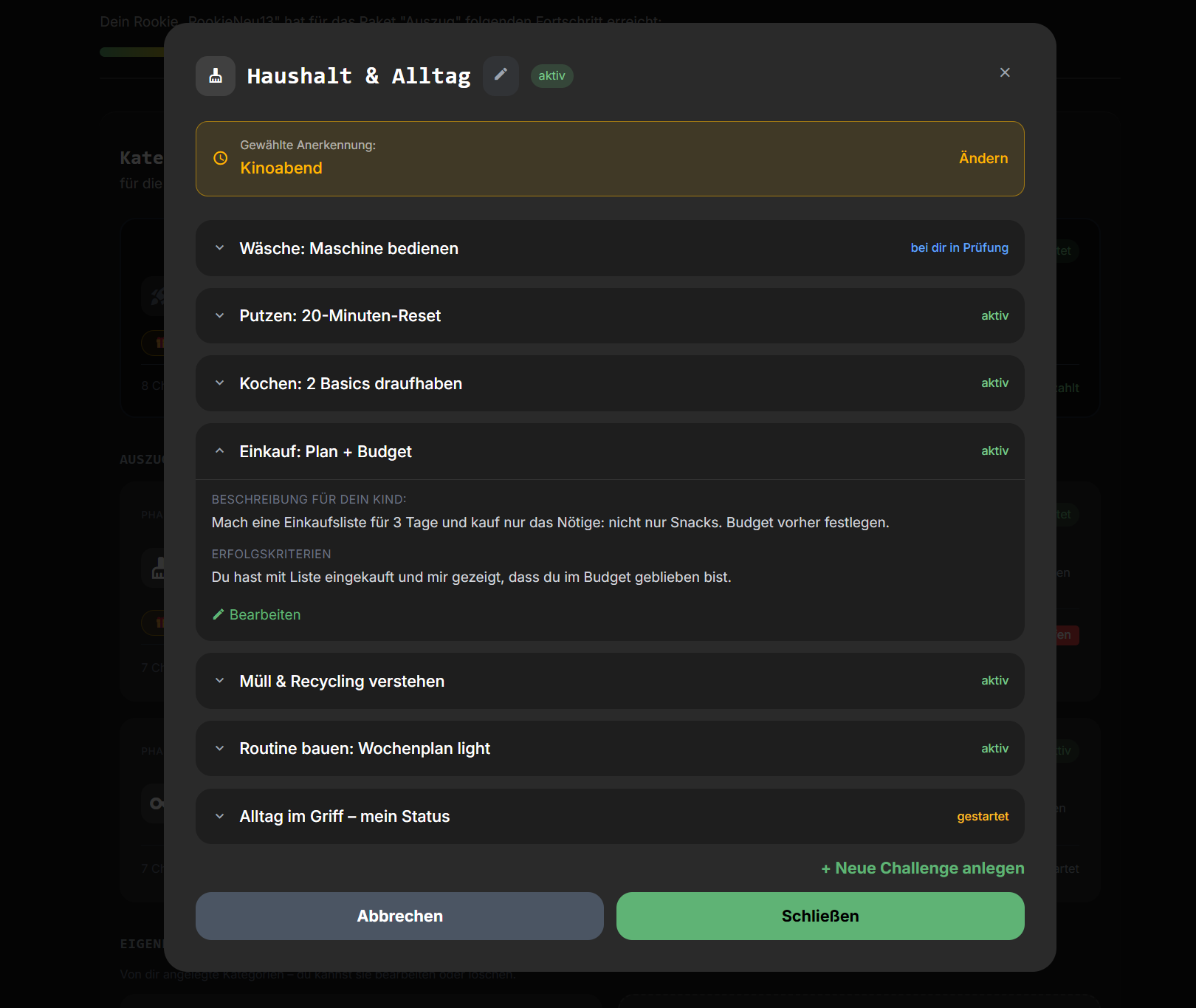 - Sieht Fortschritt und optionale Anerkennung pro Kategorie